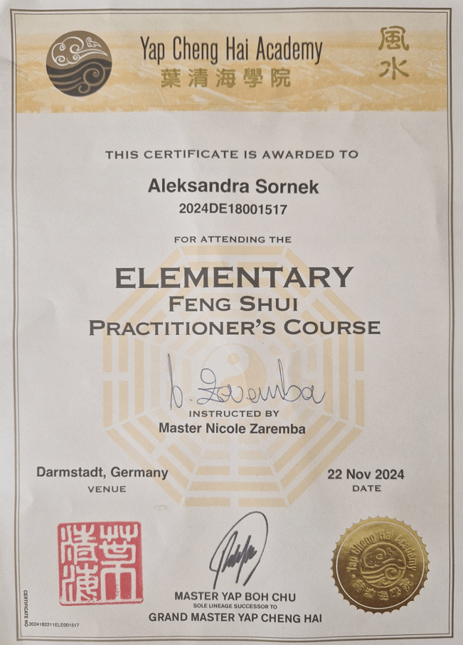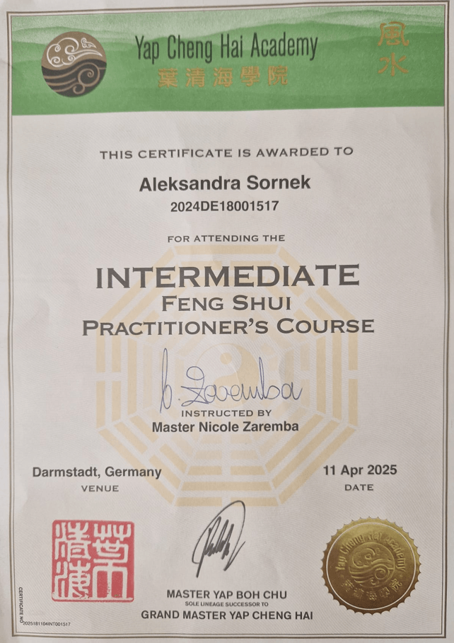 Jestem konsultantką Feng Shui, która zdobywa wiedzę w renomowanej Yap Cheng Hai Academy. Ukończyłam kursy Elementary oraz Intermediate, które dały mi solidne podstawy do pracy z energią przestrzeni w sposób klasyczny, oparty na tradycyjnych chińskich szkołach Feng Shui.