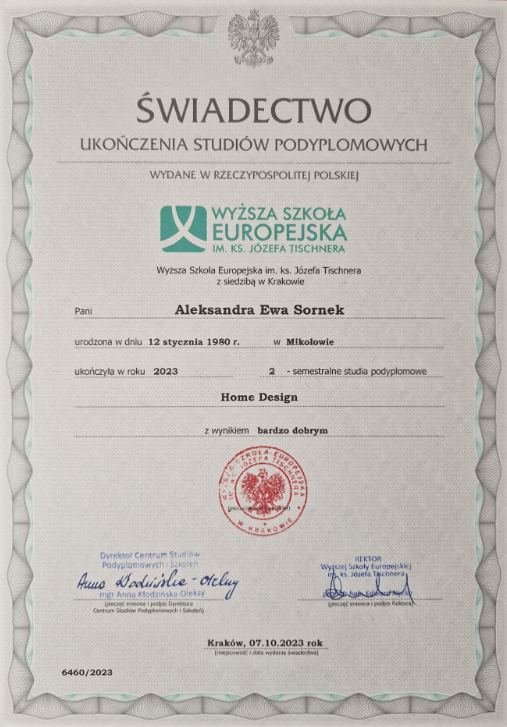Ukończyłam także studia podyplomowe na kierunku Home Design w Wyższej Szkole Europejskiej im. ks. Józefa Tischnera w Krakowie. Ten kierunek pozwolił mi spojrzeć na przestrzeń nie tylko przez pryzmat energii, ale także funkcjonalności, stylu i harmonii wizualnej. Połączenie tych dwóch ścieżek – Feng Shui i projektowania wnętrz – daje mi narzędzia do tworzenia przestrzeni, które są zarówno piękne, jak i wspierające mieszkańców na głębszym poziomie.